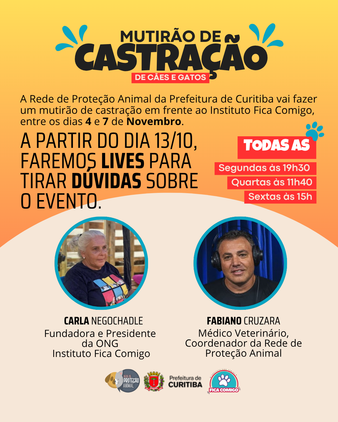 A Rede de Proteção Animal da Prefeitura de Curitiba vai fazer um mutirão de castração em frente ao Instituto Fica Comigo, entre os dias 4 e 7 de Novembro.